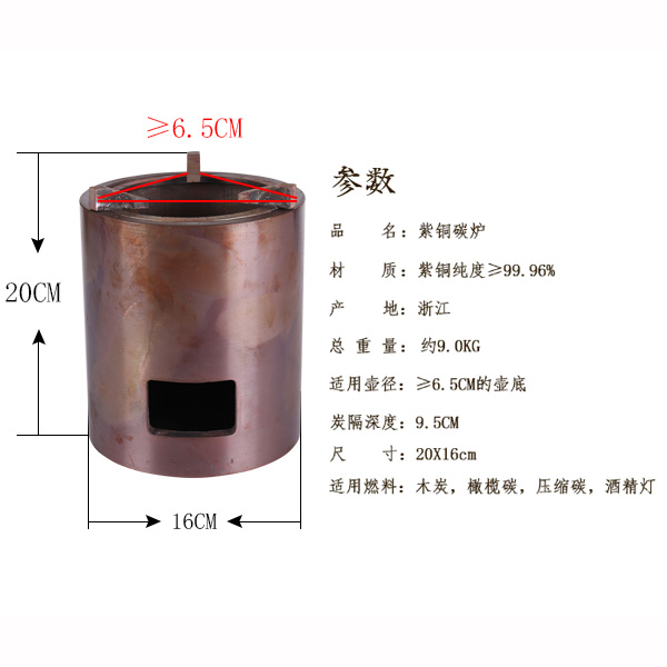 紫銅炭火爐(帶內(nèi)膽),采用純紫銅,人工與機械設備相結(jié)合制作而成,產(chǎn)品厚重,敦實。炭火爐采用10毫米厚度純紫銅制作而成,通體純紫銅,耐高溫,可玩包漿。適用于5.5-10厘米壺底直徑,適用于銅壺,鐵壺,銀壺,陶瓷壺等耐高溫器具。